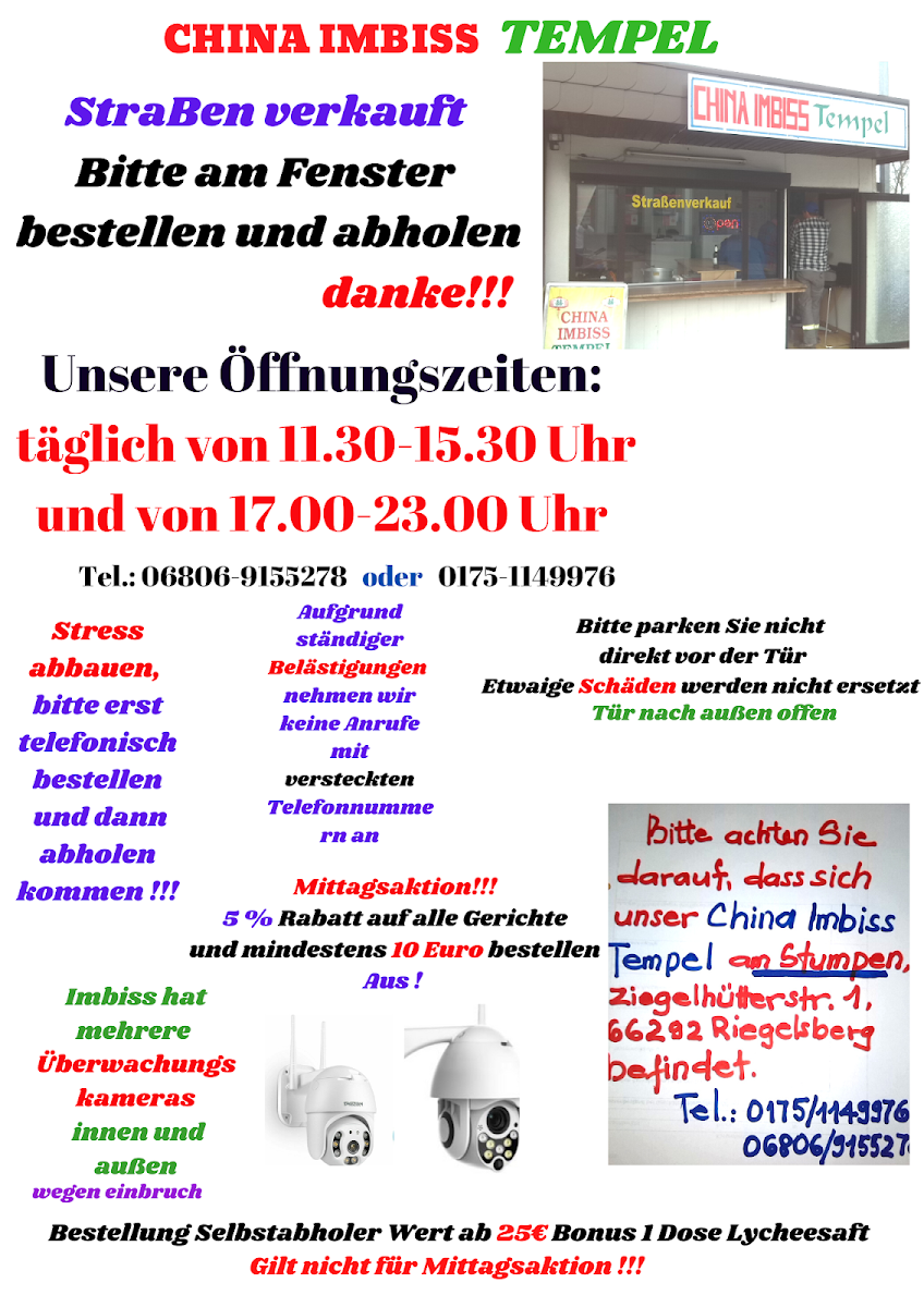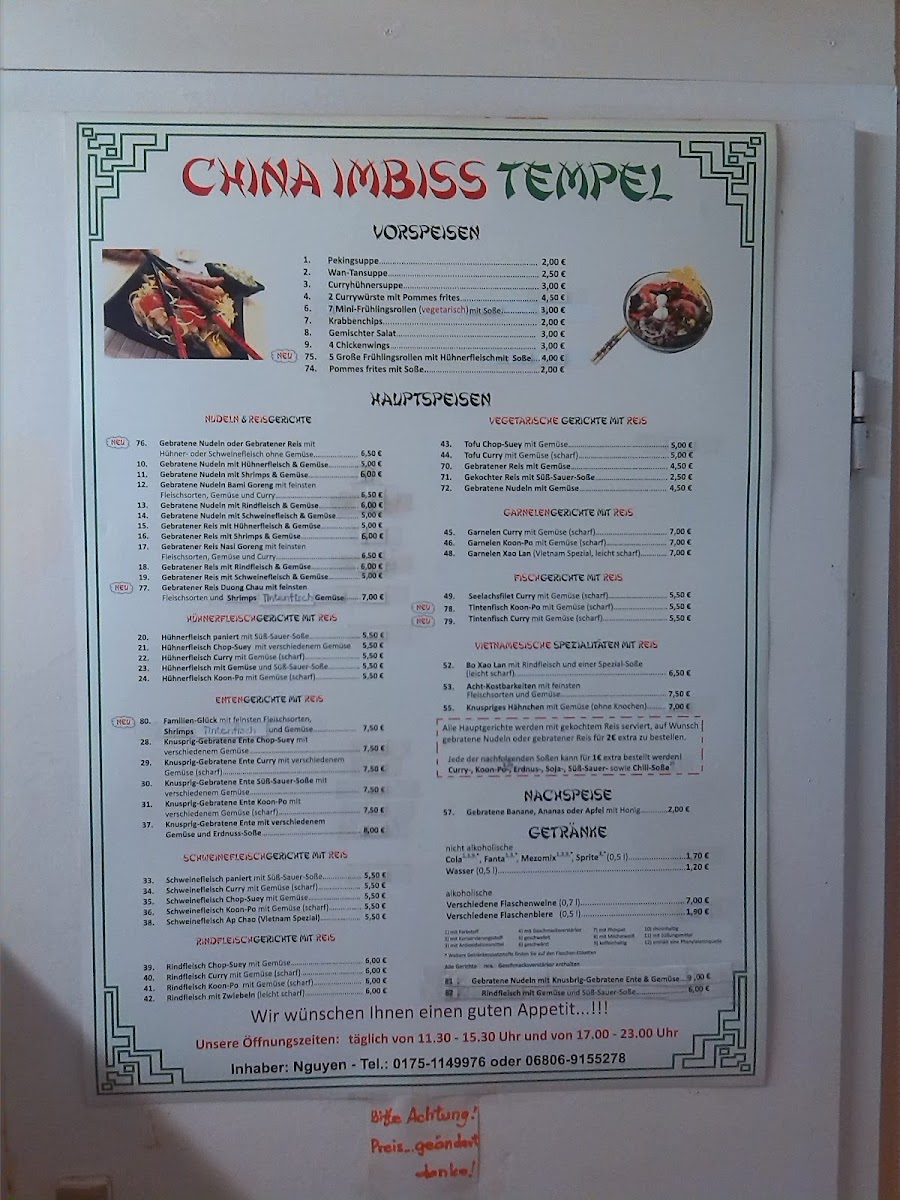 Welcome to China Imbiss Tempel, a cozy takeout haven nestled in Riegelsberg, Germany. Located at Ziegelhütter Str. 1, this gem specializes in authentic Chinese cuisine, prepared with fresh ingredients that have garnered rave reviews from loyal patrons over the years.